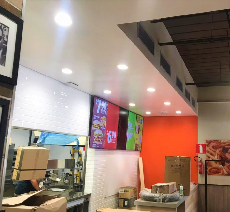 No Burger King, executamos a instalação do forro de gesso, forro mineral e paredes em drywall, proporcionando um acabamento moderno em total harmonia com o padrão visual da marca.